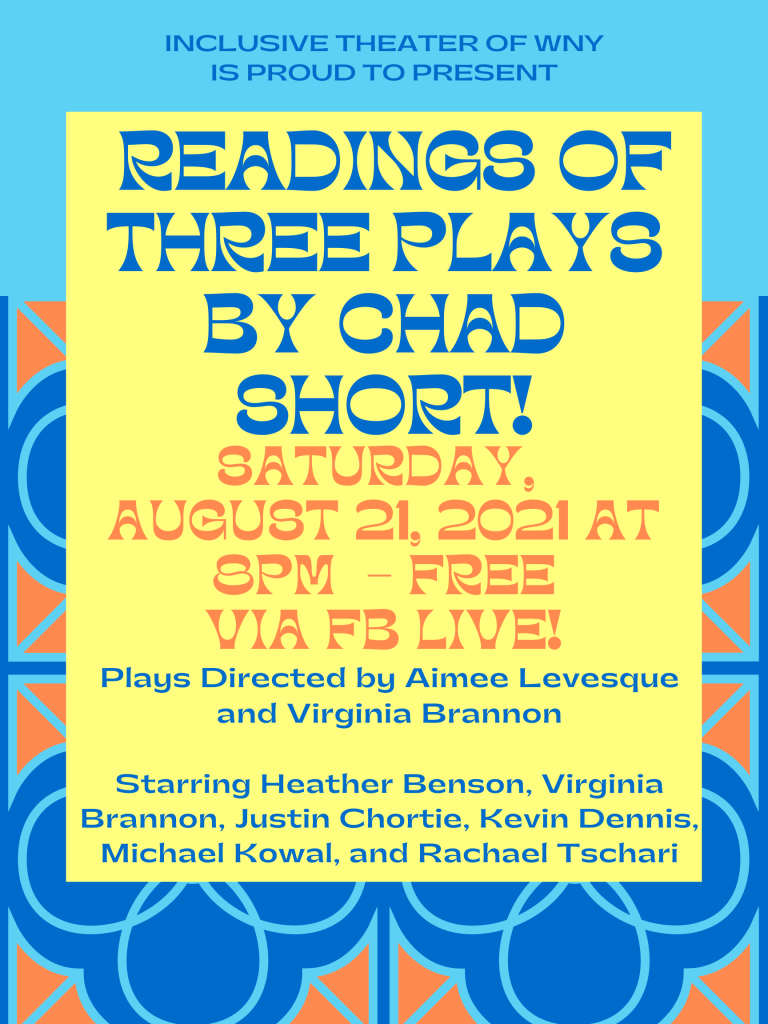 Uncategorized Three Short Plays by Chad Short – August 21, 2021 August 19, 2021 Inclusive Theater of WNY Share this: Click to share on X (Opens in new window) X Click to share on Facebook (Opens in new window) Facebook Like Loading... Related Published by Inclusive Theater of WNY View all posts by Inclusive Theater of WNY Share this: Click to share on X (Opens in new window) X Click to share on Facebook (Opens in new window) Facebook Like Loading...