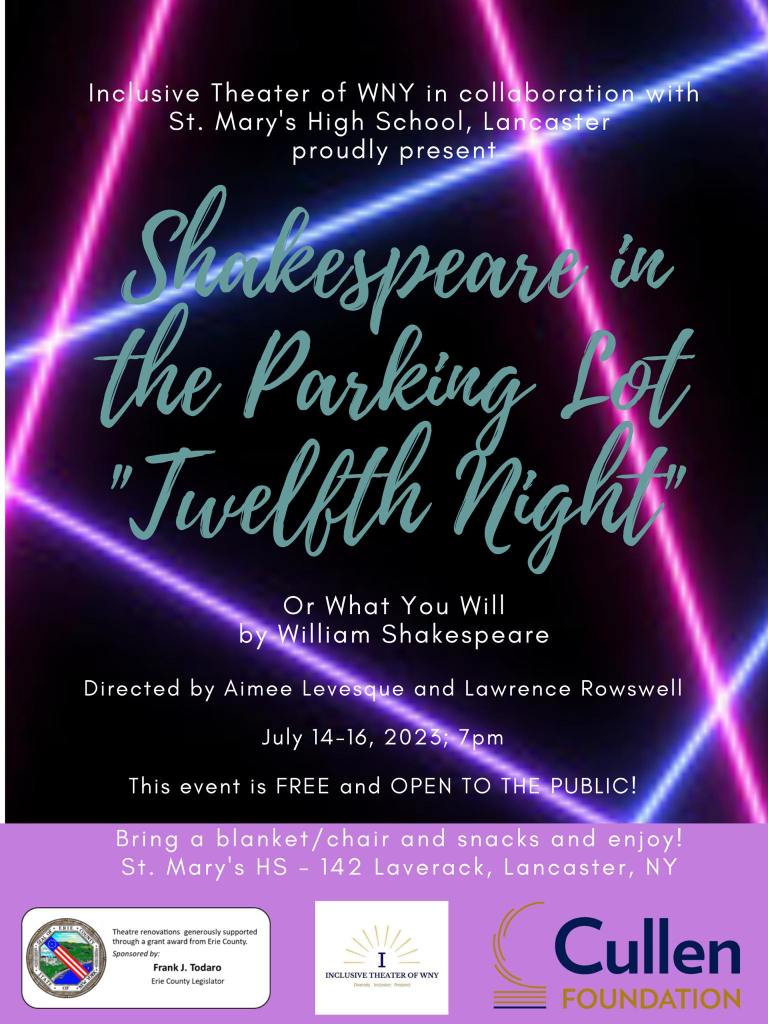 Uncategorized Shakespeare in the Parking Lot – Twelfth Night – July 14-16, 2023; 7pm at St. Mary’s High School in Lancaster July 11, 2023 Inclusive Theater of WNY Share this: Click to share on X (Opens in new window) X Click to share on Facebook (Opens in new window) Facebook Like Loading... Related Published by Inclusive Theater of WNY View all posts by Inclusive Theater of WNY Share this: Click to share on X (Opens in new window) X Click to share on Facebook (Opens in new window) Facebook Like Loading...