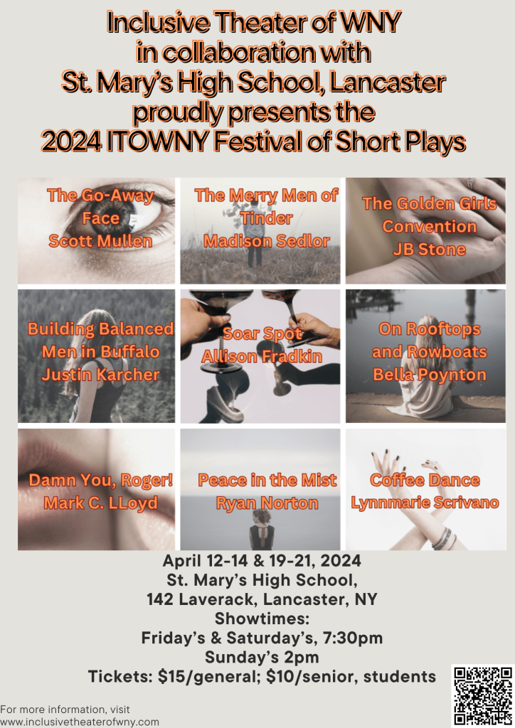 Come see the original works of nine (9) phenomenal playwrights during ITOWNY’s 2024 Annual Festival of Short plays presented by Inclusive Theater of WNY in collaboration with St. Mary’s High School. The 2024 Festival of Shorts runs April 12, 13 & 14 and 19, 20, 21 at St. Mary’s High School, 142 Laverack, Lancaster, NY. Friday and Saturday performances are at 7:30pm and Sunday matinee performances are at 2:00pm. The festival is presenting (in no particular order): THE GO AWAY FACE by Scott Mullen, The MERRY MEN OF TINDER by Madison Sedlor, THE GOLDEN GIRLS CONVENTION by JB Stone, BUILDING BALANCED MEN IN BUFFALO by Justin Karcher, SOAR SPOT by Allison Fradkin, ON ROOFTOPS AND ROWBOATS by Bella Poyton, DAMN YOU ROGER by Mark C. LLoyd, PEACE IN THE MIST by Ryan Norton, and COFFEE DANCE by Lynnmarie Scrivano.